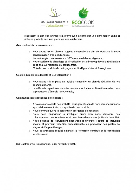 Cette démarche montre notre engagement pour la protection de l’environnement, la durabilité et notre préoccupation pour la santé des personnes. EcoCook® nous permet de garantir et valoriser nos bonnes pratiques et engagements suivants: